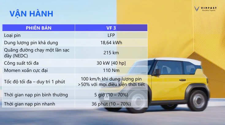 VinFast VF 3 lắp một môtơ ở cầu sau, công suất 40 mã lực, mô-men xoắn 110 Nm. Xe tăng tốc 0-50 km/h trong khoảng 5,3 giây. Dung lượng pin là 18,64kWh, cho tầm hoạt động km. Xe mất khoảng 36 phút sạc để đạt mức pin từ 10% lên 70%.