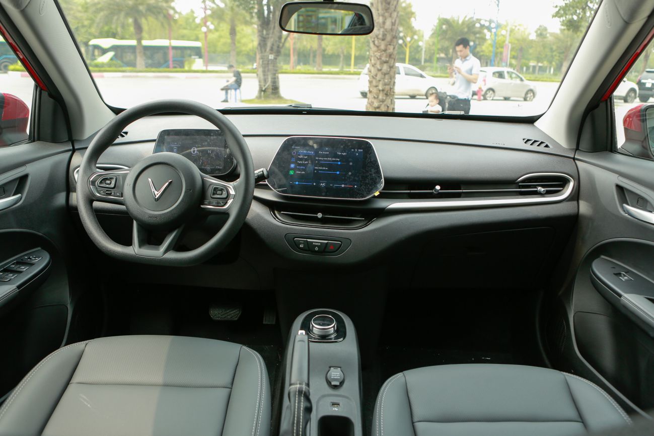 Vốn theo đuổi phong cách thiết kế tối giản nên khoang cabin VF5 trông khá đơn giản nhưng không kém phần hiện đại với sự hiện diện của 2 màn hình điện tử. Trong đó, màn hình phía sau vô-lăng đặt nổi thay cho dạng analog truyền thống và màn hình cảm ứng cỡ lớn ngay trung tâm táp-lô.